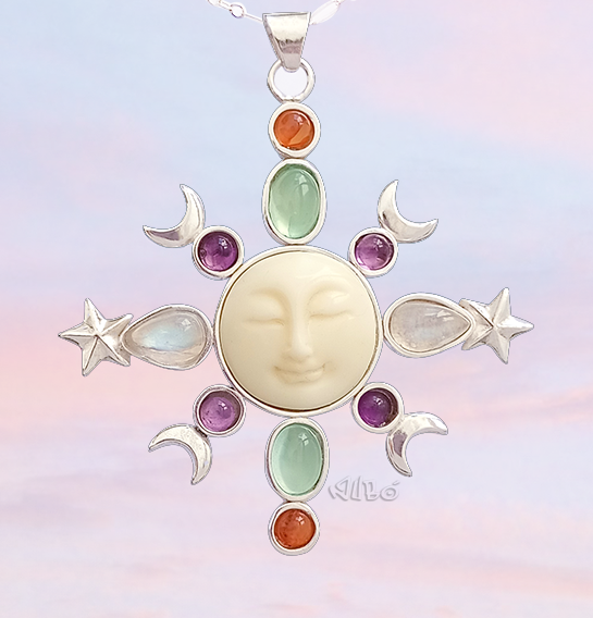Dije hecho a mano en plata ley .950 con amatista, piedra luna, calcedonia aqua y cornalina.